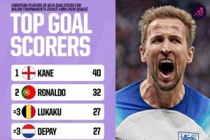 近4届欧预赛+欧洲世预赛射手榜:凯恩40球居首,C罗32球次席